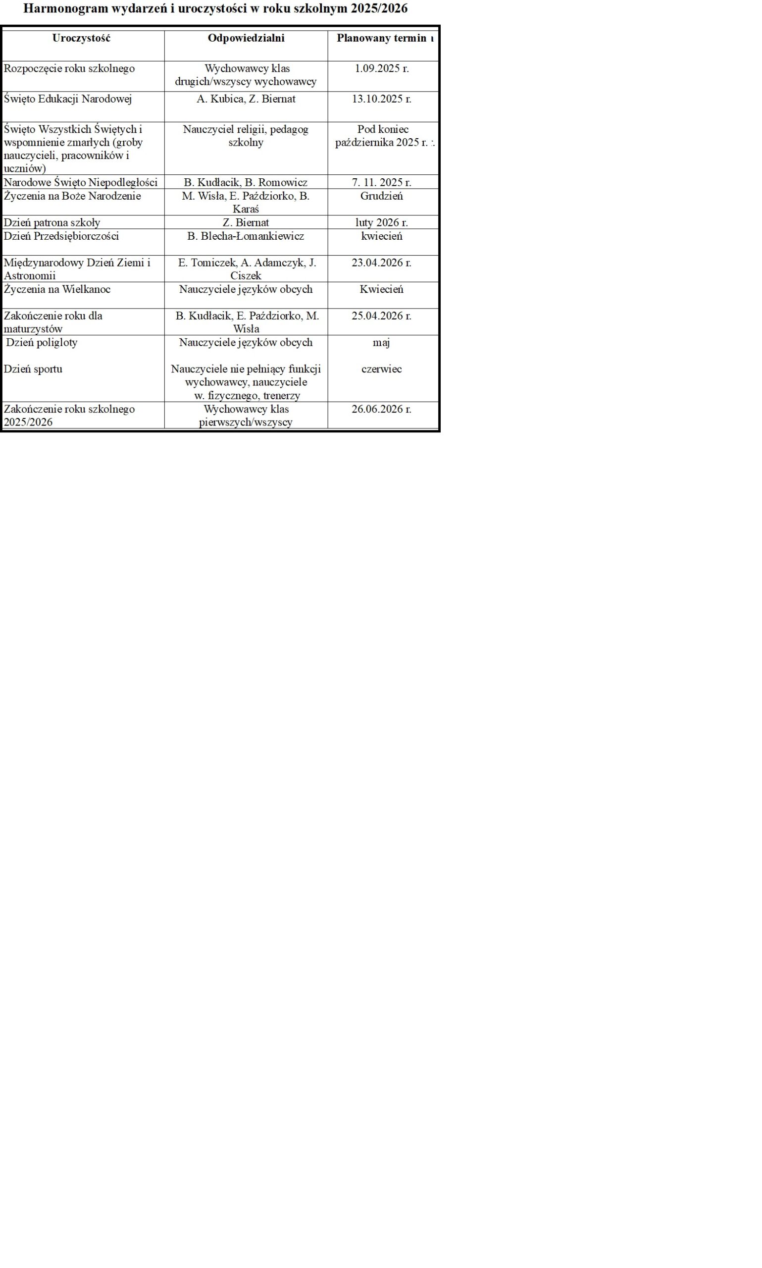 • Harmonogram wydarzeń i uroczystości w roku szkolnym 2025/2026